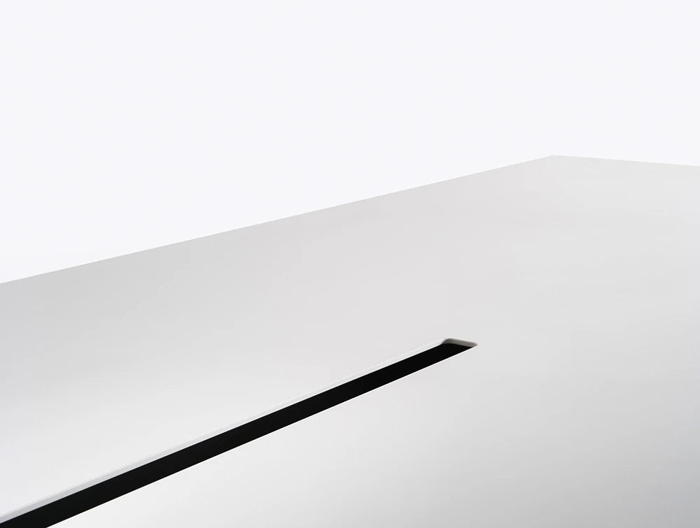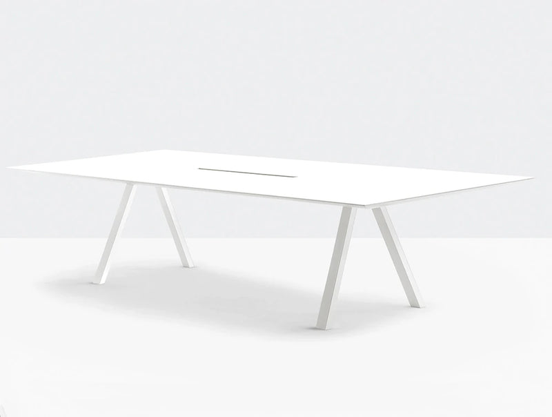 Arki-Table is linear and rigorous from a structural point of view, but at the same time versatile and designed for different uses. Table with steel trestle legs, ultra-thin solid laminate top with cable management supported by an extruded aluminium frame. Arki-Table, 6mm solid laminate top, frame made of extruded aluminium, trestle steel legs. Arki-Table is suitable either for meeting areas or for restaurant halls. Width available in 2400, 3000 and 3600mm variants.