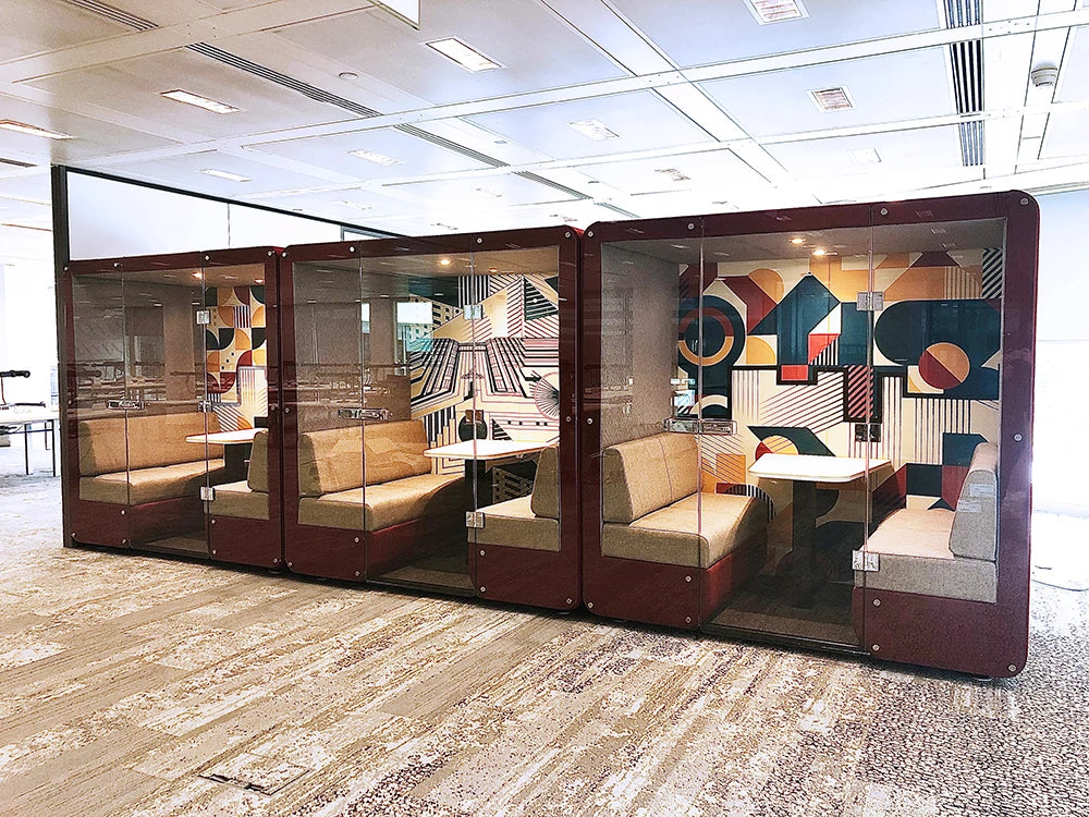 Meet Bob 2-Person Meeting Pod with Glass Front and Back. The Bob collection with glass doors offers comfort and greater privacy. The design, based on mobile devices utilises large flat panels and soft rounded corners which not only look great but reduce and absorb sound.