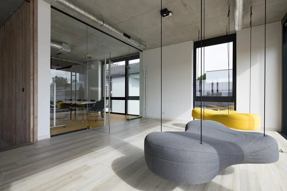 About The irregular, amorphic form of the sofas allows the creation of an unusual public space. The modules are on small hidden wooden legs so that the sofas look like they are lying directly on the ground, or they may be suspended on ropes, which gives the impression of floating in the air. The main feature of the design is the possibility to provide varied bases in terms of functionality and appearance.