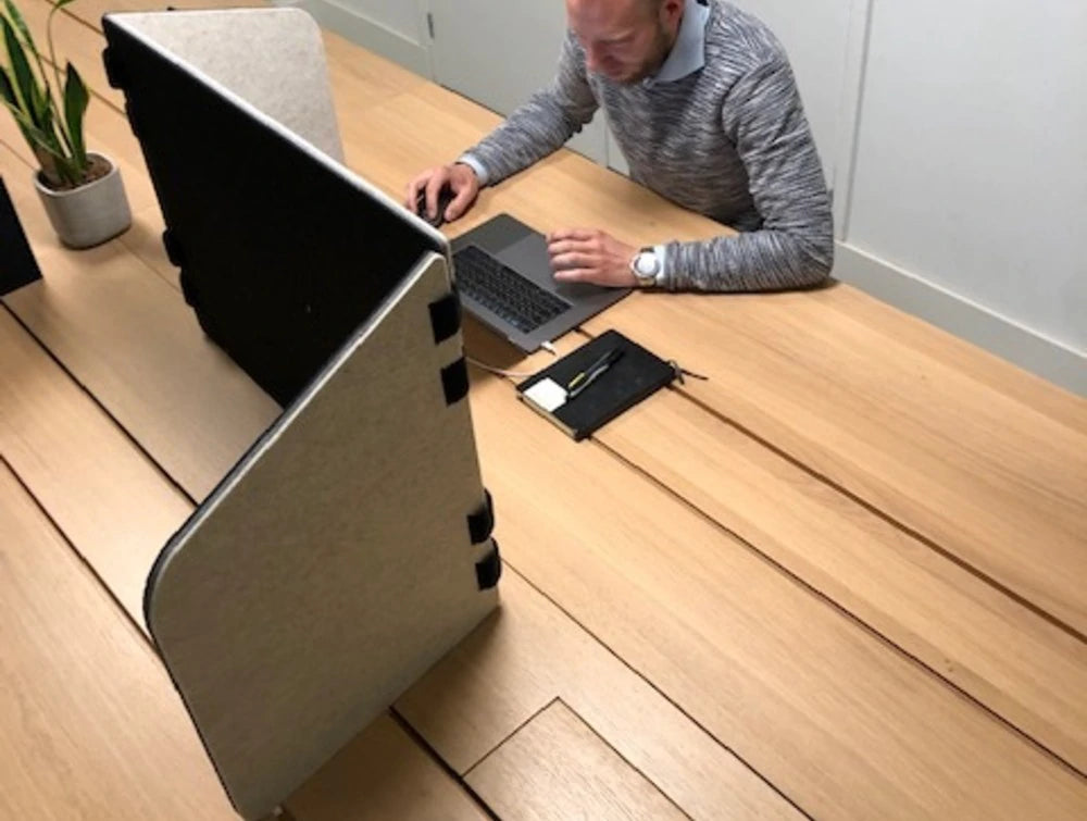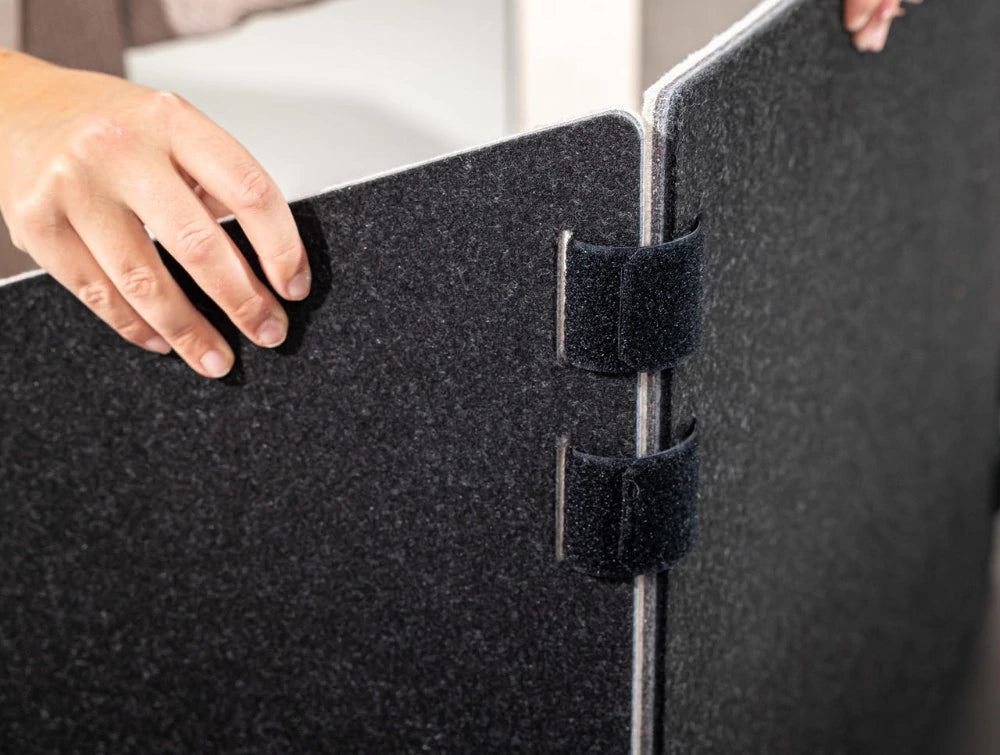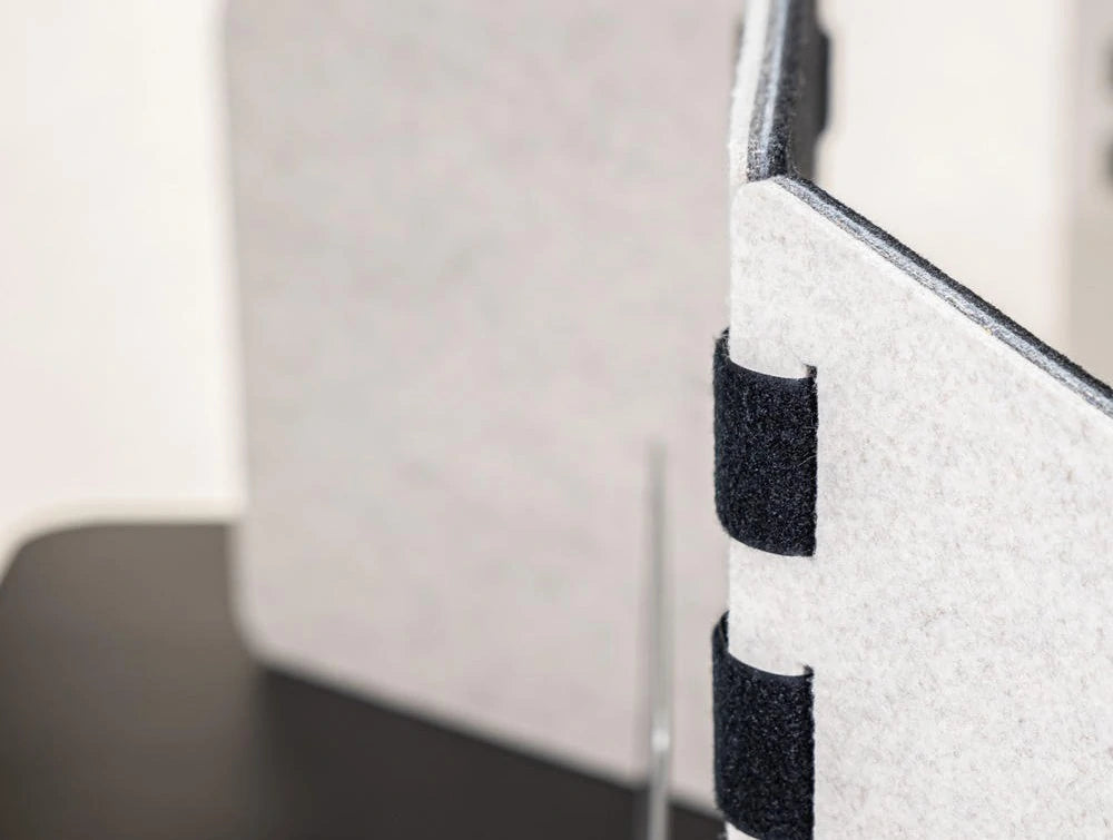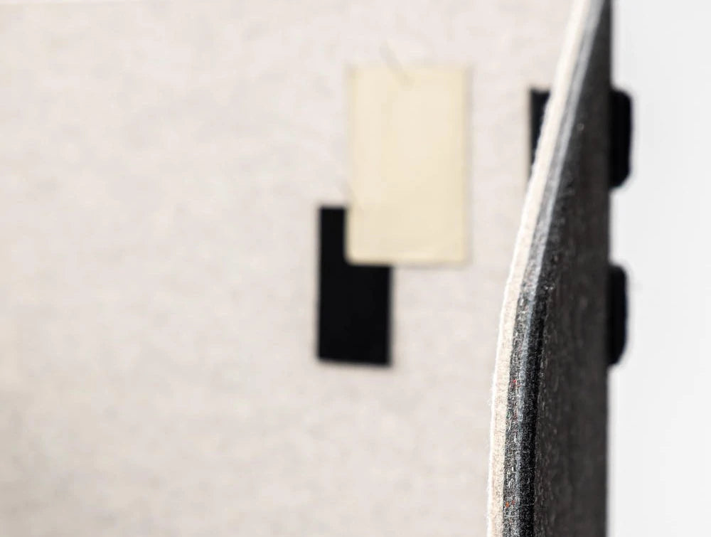 Made of three layers of felt. It's specifically designed with today's compact homes and the new ways of working in mind, allowing you to focus while your family or your flatmates are around. Create a small, temporary office for focused work on your kitchen table with BuzziTripl Home Free-Standing Desk Partition. Just choose the level of privacy by turning the side panels, joined together with Velcro strips. When folded BuzziTripl is so flat that it fits perfectly under the bed or in a cupboard.