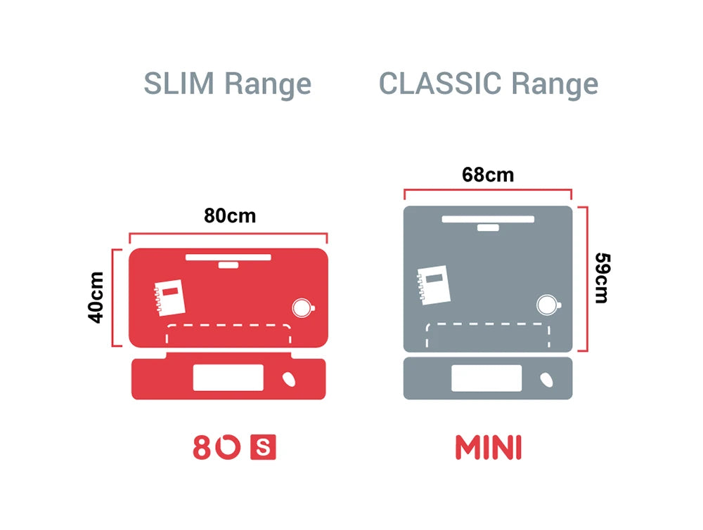 DESK SLIM is a new range of standing desks which glide effortlessly up/down to 30 adjustable heights using a unique Quick-Release lock. An optimal ergonomic solution for users below 162cm tall, as it has more adjustable heights at lower levels. DESK 80-S Sit-Stand Solution is 80 cm wide and suitable for SINGLE monitor workstations or smaller desks. Designed by experts, DESK 80-S has a SLIM worktop (i.e. 8 inches thinner than the best-selling DESK CLASSIC range).