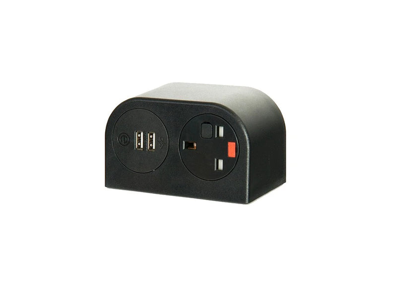 Can be positioned on a work surface or mounted to the underframe of the sofa or table top. Two options of power modules available. Able to be retrofitted on all booths and sofas. Available in black only. Available in 2x UK or 1x UK Power and Twin USB Charge (1x Type-C and 1x Type A).