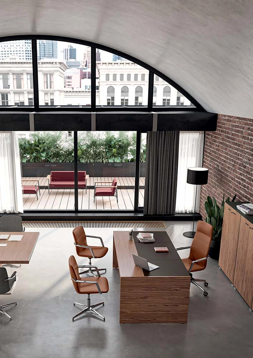 This line is a dynamic and versatile interpretation of the X9, with the addition of a panel leg that enhances executive rooms of all sizes. The veneered wooden surface can be decorated with leather inlays for a sensation of refined softness to the eye and the touch. Available in different configurations and sizes, the model with a writing desk comes with a chest of drawers and additional functional accessories. The collection creates contemporary looks thanks to multiple finishing options for the desk surface and the leg panel, including anthracite-coloured melamine, exalting the uniqueness of every executive style. Also available in the meeting table version, with different size and composition options.