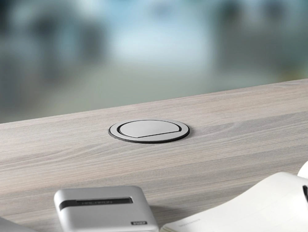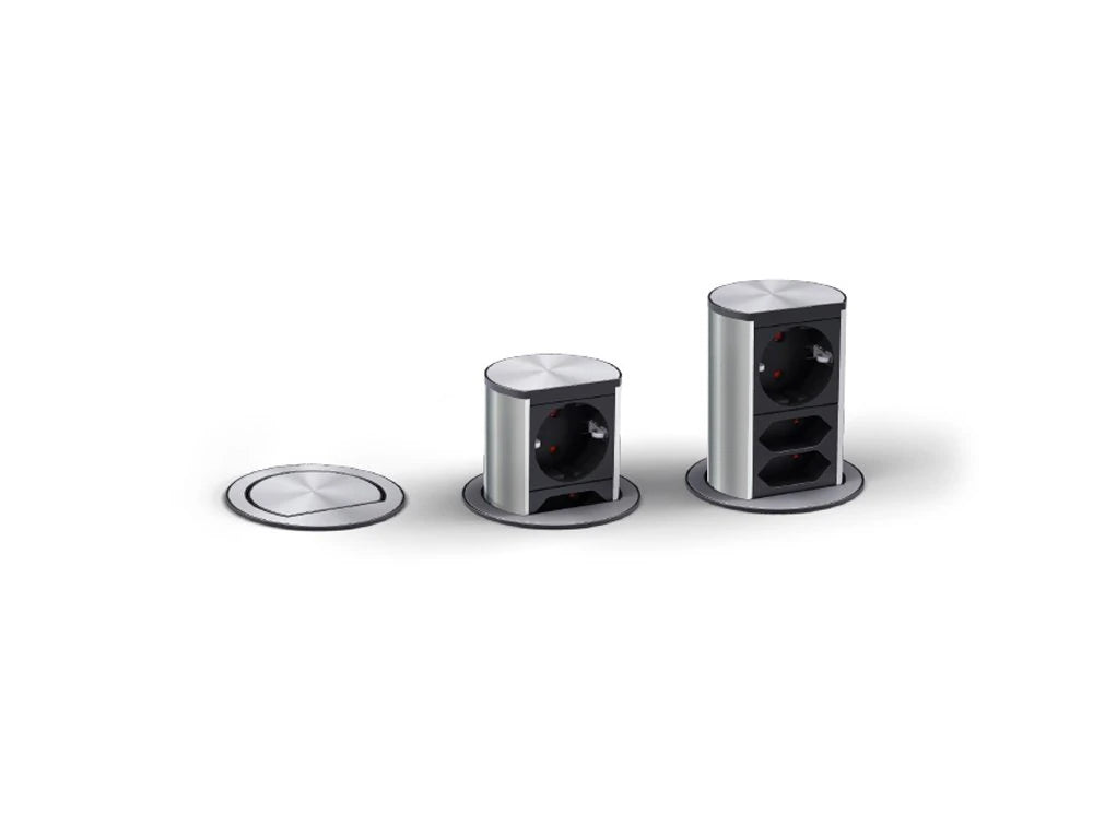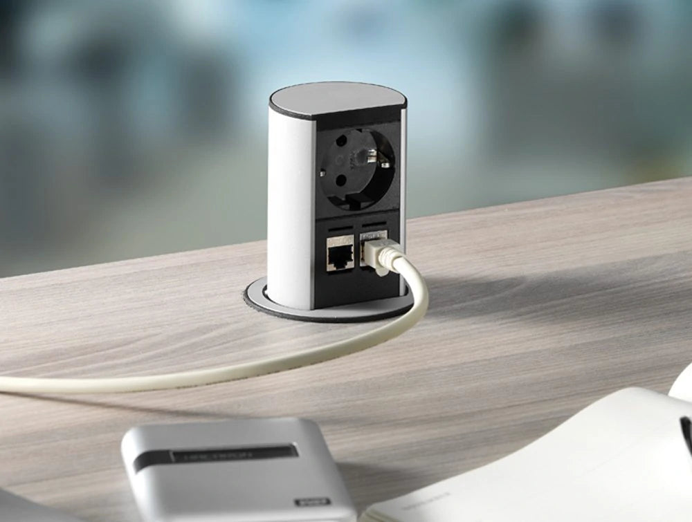 The Elevator can be integrated into your existing office desk and is simple to install. Brushed aluminium and nickel-plating adds a modern feel.