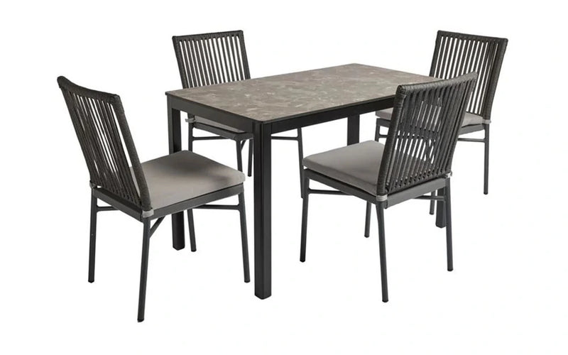 Comes with a rectangular marble top dining table and roped backrest outdoor dining chair