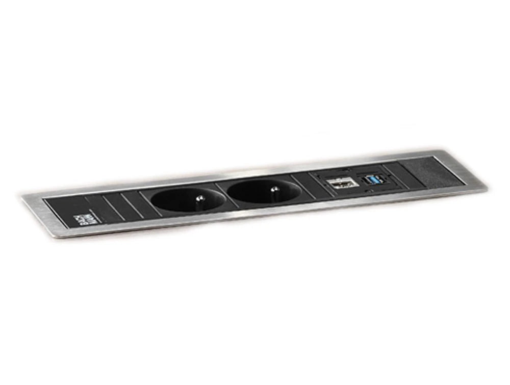 The Power Frame provides complete power strips for your office desk, and features compact dimensions. It's quick to install and versatile to use.