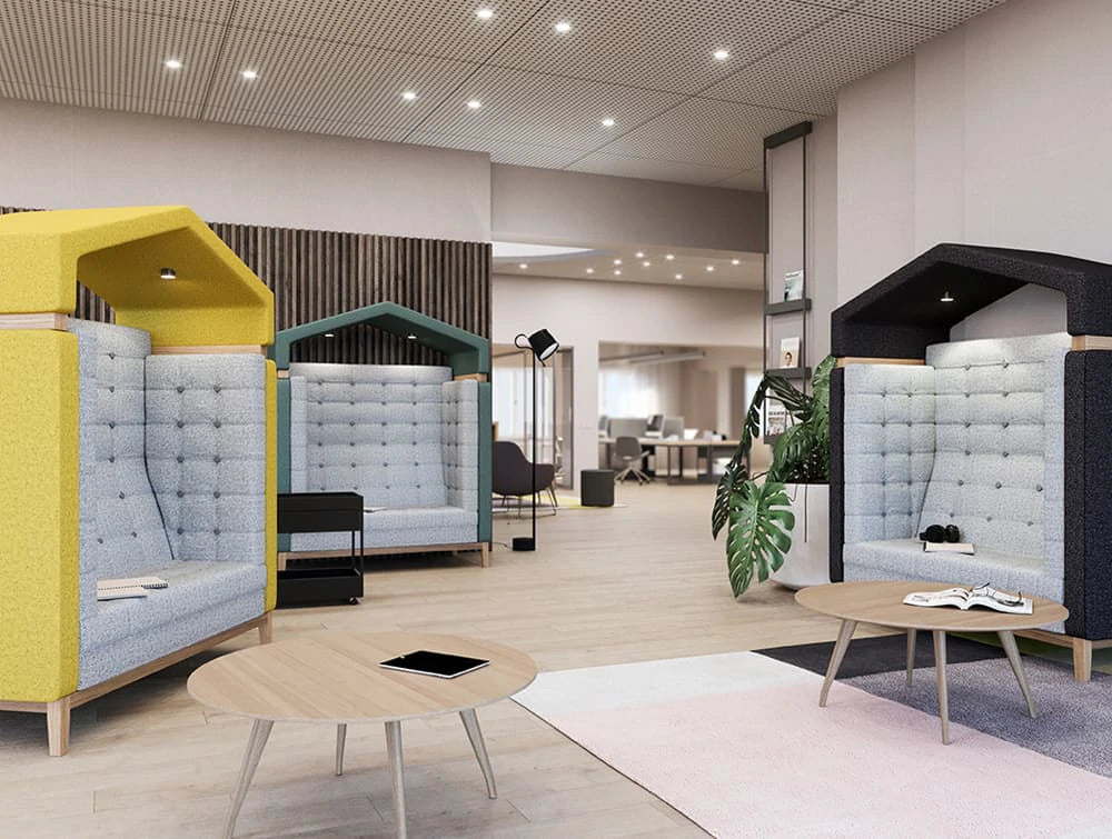 This 2-seater Acoustic Meeting Pod features a Solid oak frame with deep-foam seats. The office pods upholstery can be customised with an extensive choice of fabrics, vinyl and leathers. Optional LED lighting available for roof.