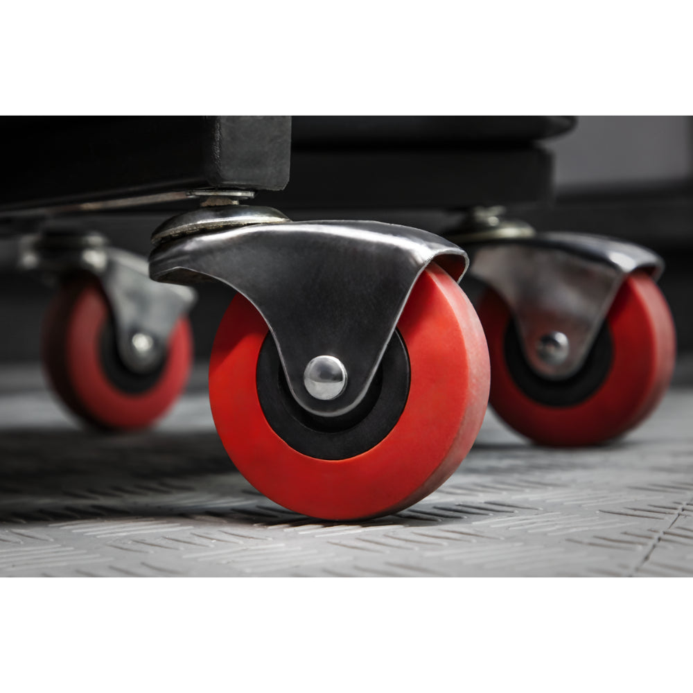 Pneumatic mechanics seat with lever-operated height adjustment from 380 mm to 500 mm, on a five-castor base for smooth movement. The Ø380 mm padded seat swivels fully for ease of access and the base tray serves as a handy platform for tools or components. Built for workshop use with a load capacity of 136 kg - ideal for mechanics and industrial environments.