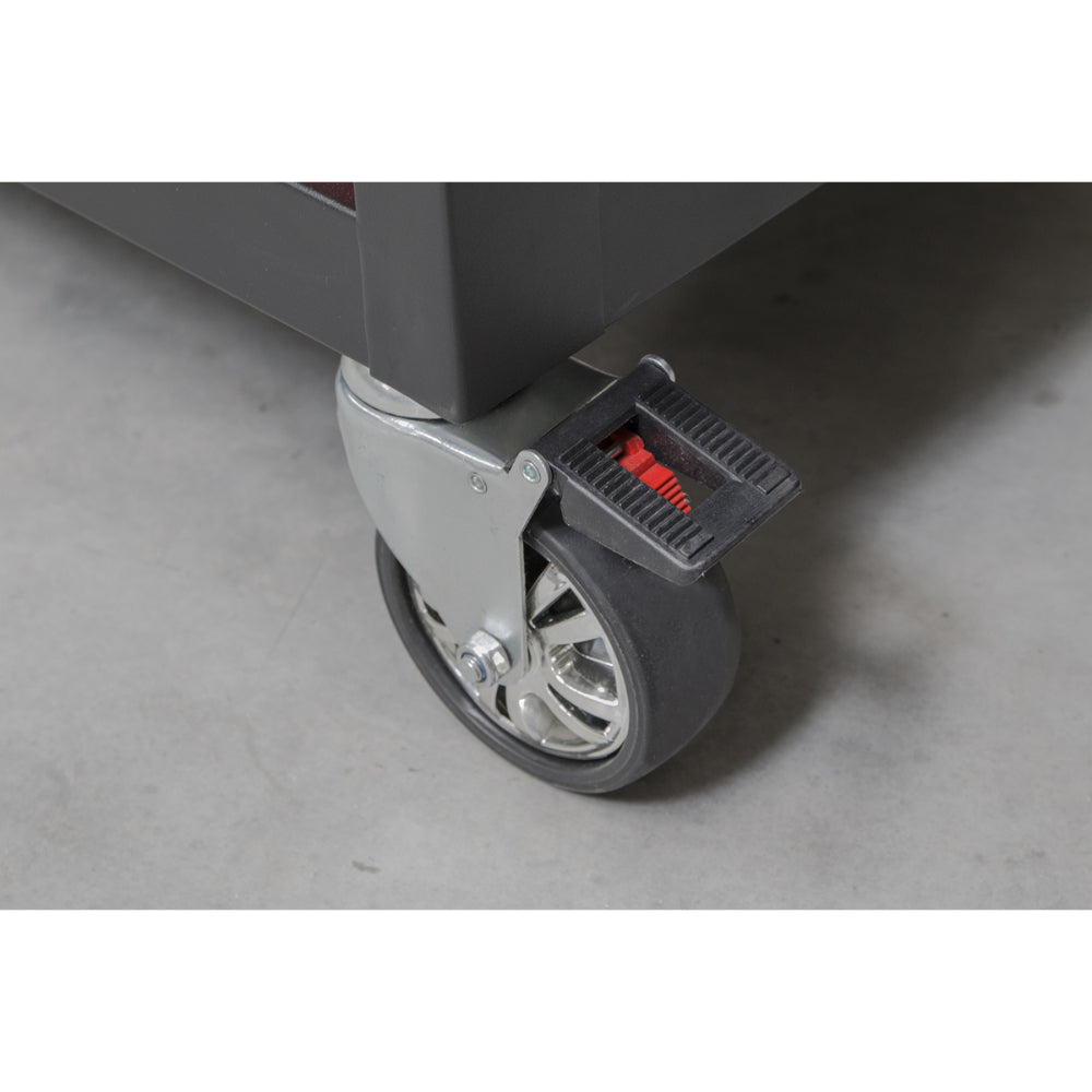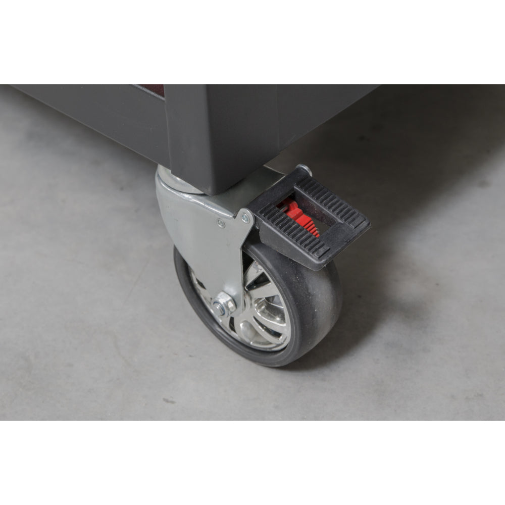 Heavy-duty mobile workstation with ten robust drawers featuring 45 mm ball-bearing slides and a 40 kg capacity per drawer. Aluminium handles and 2.5 mm EVA non-slip liners enhance usability. Dual locking drawer sets provide secure storage, with perforated steel panels for hanging tools. The top is lined with a 10 mm EVA mat, and mobility is offered through four alloy-style Ø125 mm castors (two swivel with brakes) and steel handles at each end - perfect for professional workshops.