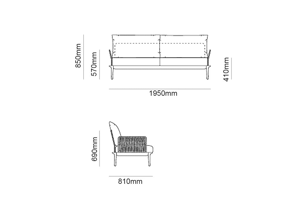 Reva Twist is an outdoor collection with smooth lines and generous sizes. Three-seater sofa with for tapered legs in die-cast aluminium placed at the extremities of the perimeter frame in extruded aluminium. The steel backrest and armrests are woven with a flat rope in weather-resistant polypropylene. Polyester cushions upholstered in fabric. This comfortable Reva Lounge Outdoor Three-Seater Sofa outdoor sofa offers elegant appeal that suits any outdoor home setting.