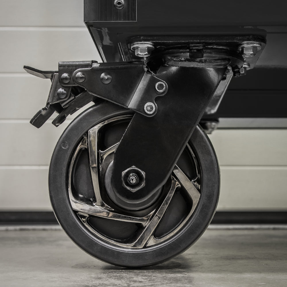 A heavy-duty side locker on castors, standing 1 864 mm tall and built with rugged steel construction including inner steel walls for enhanced durability. Features four self-adjusting powder-coated shelves, two Ø152 mm polypropylene wheels with black chrome-effect alloy rims and quick-release anti-rotation toe-locks, a textured industrial finish and included folding key lock - ideal for professional workshop storage.
