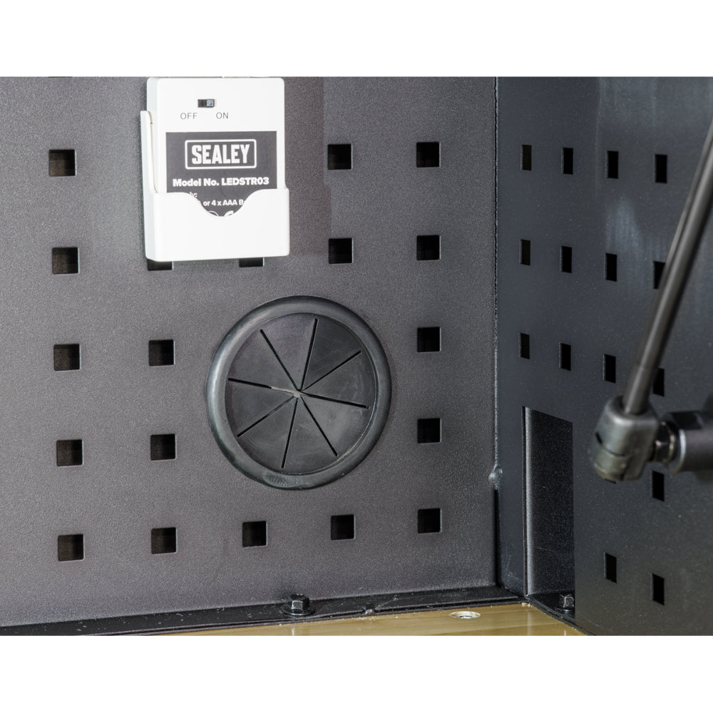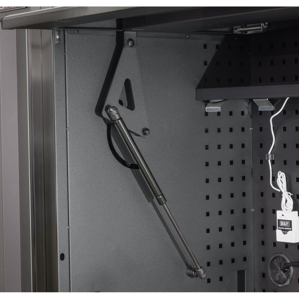 Heavy-duty top hutch with a 2-drawer riser in a 1 549 mm wide configuration, built for workshop storage systems. Features robust all-steel construction with steel inner walls, two riser drawers with 45 mm ball-bearing slides and full-height rear locking mechanism, non-slip liners and an upper hutch with gas-strut door, full-length shelf and pegboard back. Includes integrated power strip (4 × 230 V & 2 × 5 V USB) and LED lighting: ideal for professional garages.
