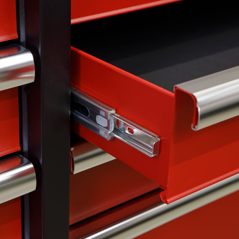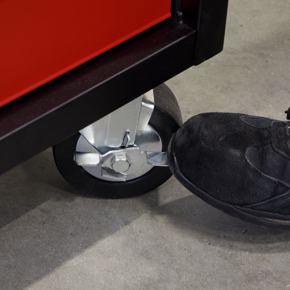 Mobile workstation with back-board and ten heavy-duty drawers, each rated at 40 kg, featuring a 20 mm thick wooden worktop, non-slip liner drawers with aluminium handles, a peg-board back panel for tool storage and six large castor wheels (four swivel with brakes). Built for demanding workshop environments, this unit also includes a robust side-handle for manoeuvring.
