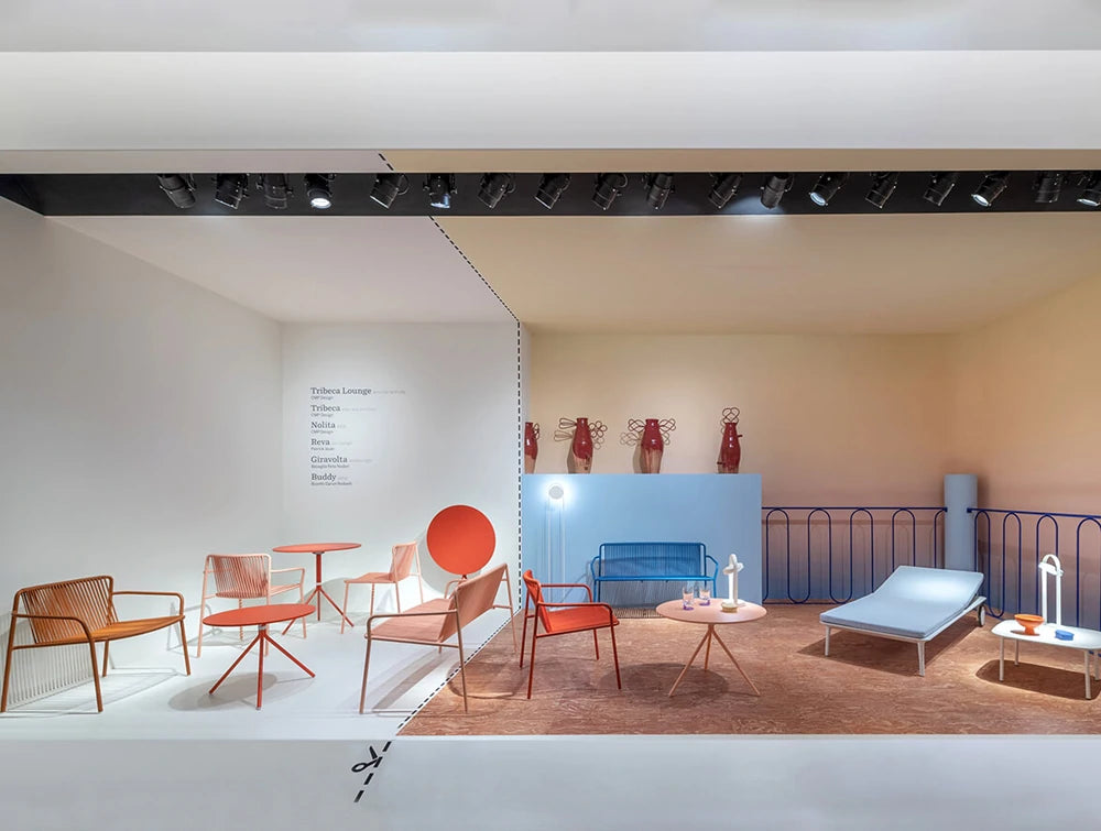Tribeca evokes the comforting echoes of the past, offering a modern reinterpretation of the classic Sixties patio chairs made from steel and woven cord. The lounge chair has a steel tube frame 20mm in diameter powder coated for outdoor use, back and seat in vertically-woven extruded PVC with nylon core. Tribeca takes us back in time with a modern reinterpretation of classic Sixties patio chairs made from steel and woven material. The collection is specifically designed for outdoor use.