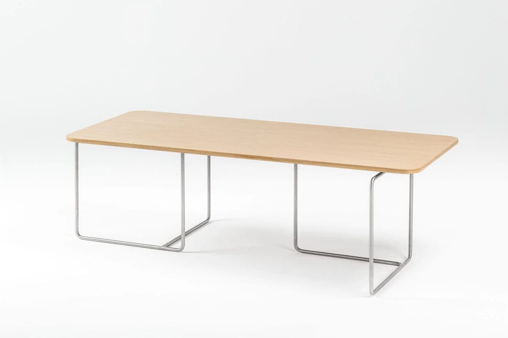 Collection of tables with characteristic oval edges of the table top combined with a square Sectional frame varnished in black or grey. Table top is covered with modified oak veneer in three colours: milk, coffee or cocoa.