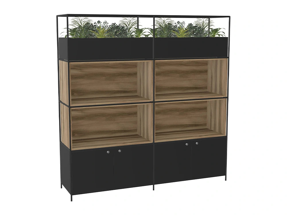 Discover the Ws.D Ionic Modular Storage, an adaptable and stylish solution for any space. Available in a choice of grid finishes - black, white, brass, and copper - this system is fully modular, allowing you to create bespoke designs with our 3D configurator. Build your storage using grid blocks in cubes or double cubes, perfect for crafting bookshelves, storage units, media units for meeting rooms, and innovative furniture for zoning spaces. Ideal for open-plan offices, the Ionic system effortlessly separates workspaces from breakout areas and can be tailored to suit home offices, libraries, and conference rooms. Personalise your design with an array of MFC wood finishes, ranging from traditional wood tones to vibrant colours. Enhance your setup with a wide selection of accessories, including plants, shelves, alcoves, and integrated storage. With Ws.D Ionic Modular Storage, the possibilities for customisation are endless, bringing both functionality and style to your environment.