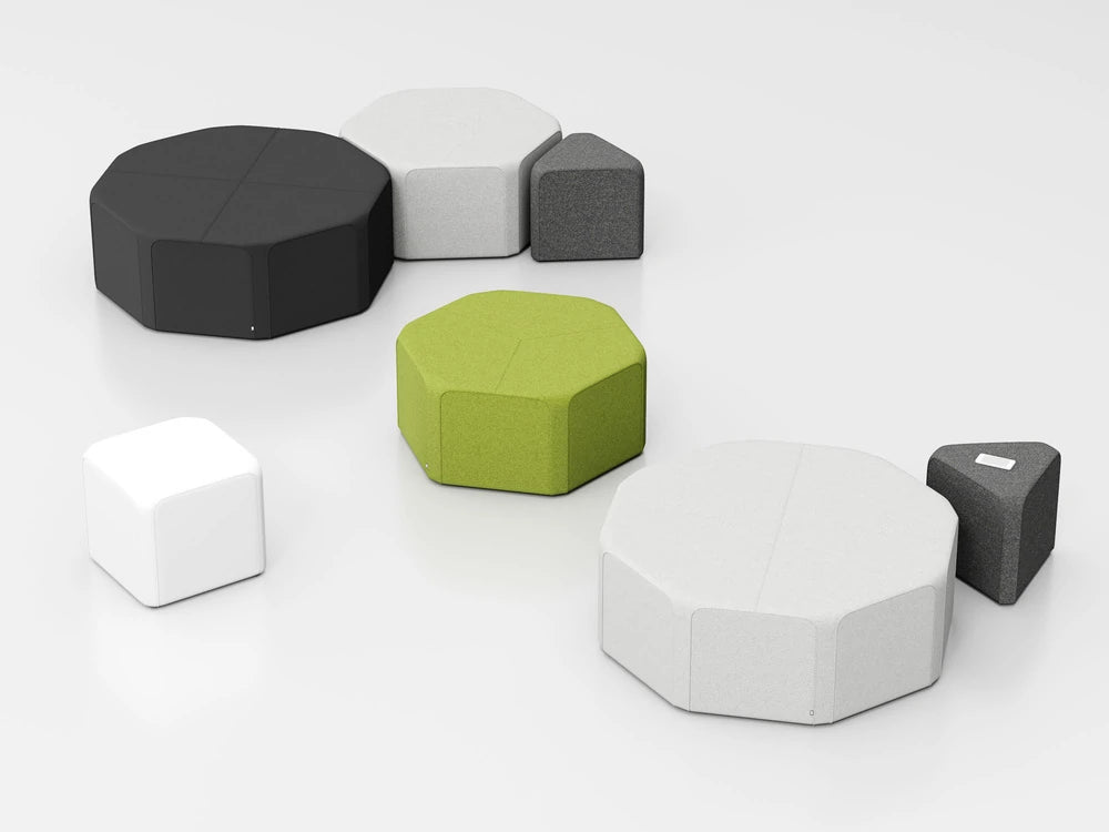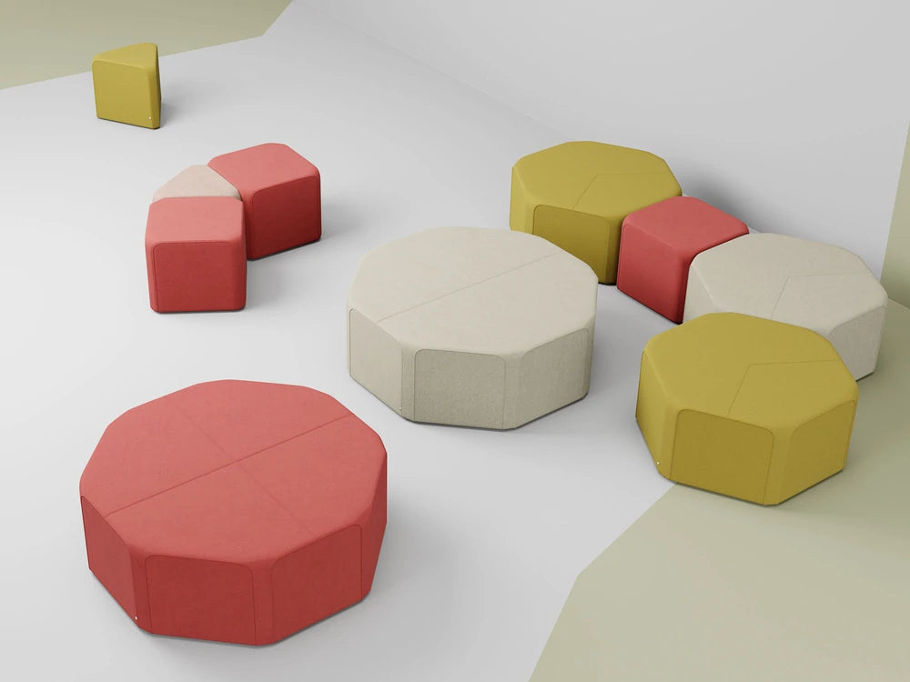 x40 is a family of for pouffes with polygonal bases. The seats have been designed on triangular, square, hexagonal and octagonal plans. The element shared by all the solids is a rectangle with rounded corners, 40 cm in width. Thanks to identical sides, the pouffes can be placed in a variety of arrangements. Based on this distinctive repetitive quality and the broad range of fabric colours, users are able to try out a variety of arrangement possibilities. The basic structural elements are styrofoam profiles covered with polyurethane foam. As a result, the pouffes are very lightweight and can be rearranged as often as you please. The x40 family is an excellent choice for furnishing public utilities and modern residential interiors.
